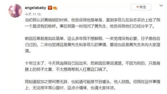 看似澄清的一篇文章,却将锅甩到了黄晓明头上。字里行间都透露出当初是因为黄晓明的原因才让自己背负了“小三”的名义,自己对这件事完全不知道。或许这也是两人离婚的导火线之一吧! |