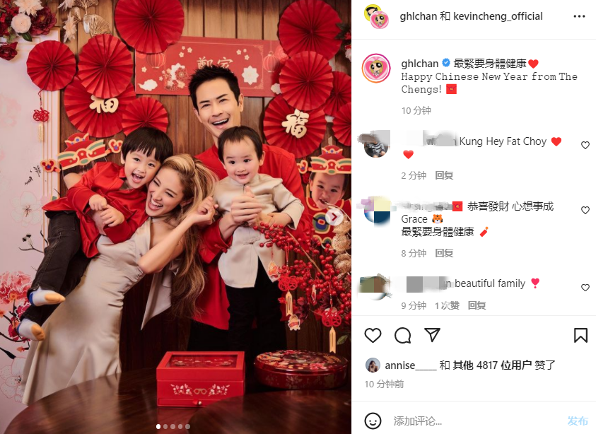 2月1日大年初一,郑嘉颖夫妻在社交账号上同步晒出全家福,跟一众粉丝们拜年。 |