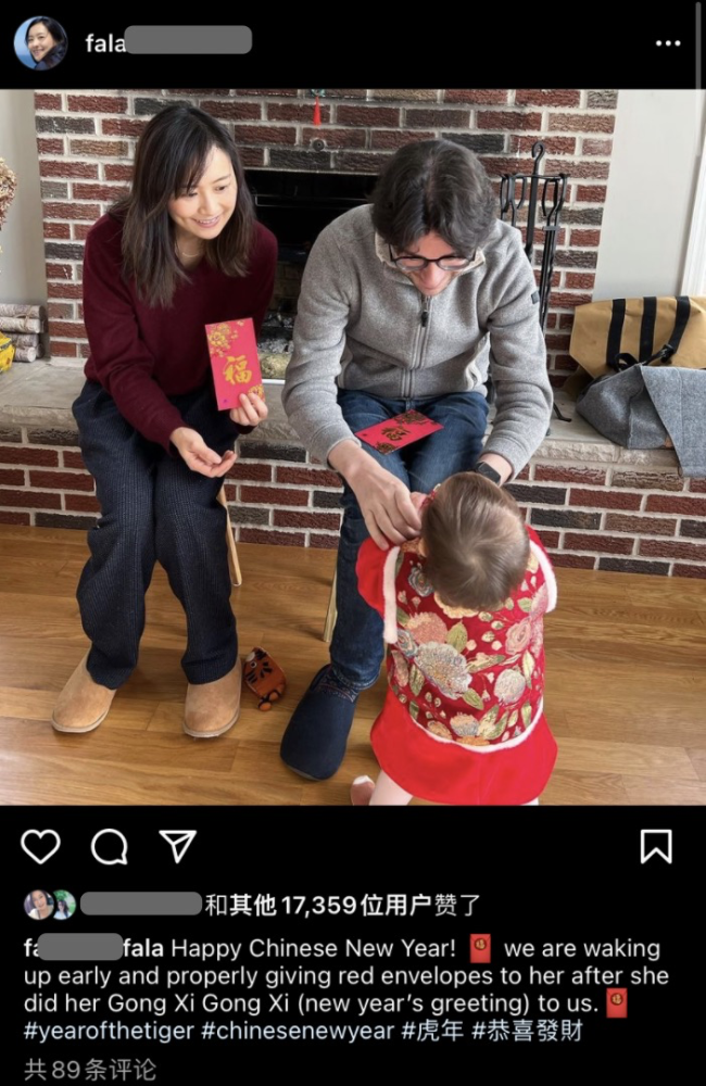 2月1日,是虎年春节大年初一,女星陈法拉罕见晒家庭幸福日常。 她附文写道“Happy Chinese New Year! we are waking up early and properly giving red envelopes to her after she did her Gong Xi Gong Xi (new year's greeting) to us.(新年快乐,我们早早起来,在她向我们拜年后给了她红包)”。 |