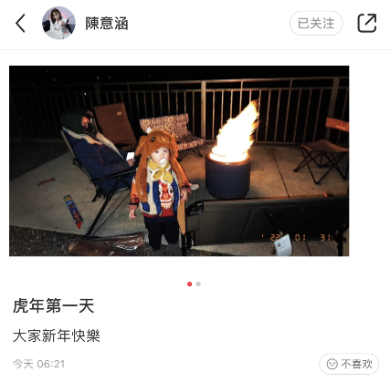 2月1日大年初一,祝福大家虎年快乐,万事如意! 香港女星陈意涵一早在社交账号晒全家福送祝福,因为家有奶宝,陈意涵的作息时间比较规律,早起跑步奶娃,晚上早早入睡,坚持分享自己的生活动态。 |
