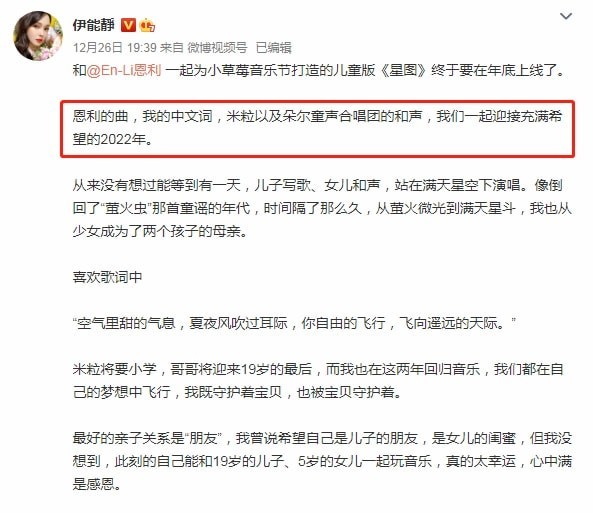 12月26日,伊能静在个人社交平台发文称将有新的音乐作品在年底上线。 儿子恩利谱曲,女儿米粒和声,一家三人齐上阵。 这首新作品属实是给我们带来一大波惊喜,网友们也都非常喜欢,希望恩利在家人的支持下继续“特立独行”做自己。 |