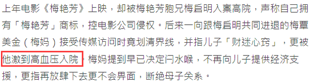 直到去年,《梅艳芳》同名电影上映后,梅启明称这部影片侵犯了他的商标权,想要借机再赚一笔钱,最终没有成功。覃美金因为这件事和儿子产生了分歧,不再盲目地支持他,两人逐渐分道扬镳。 |
