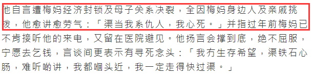 梅启明认为他们母子俩走到今天这一步,全都是因为亲戚在挑拨离间,所有人都视他为仇人,外界的恶意让他内心十分痛苦,直言自己一定会比妈妈更早离开人世,有了寻死的念头。 |