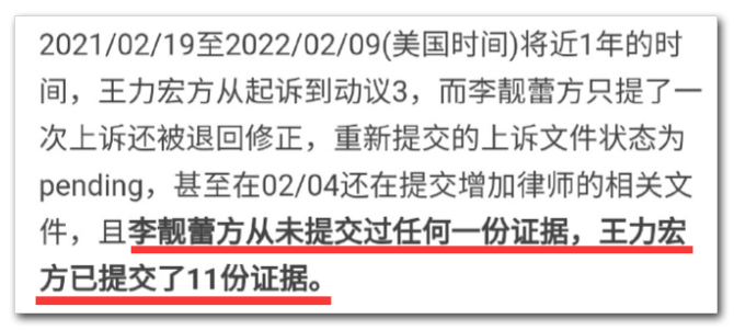 从诉讼进展上看,王力宏已经提交了11份证据。 而李靓蕾从未提交过一份证据,王力宏转移财产的证据没有,冷暴力的证据没有,甚至连出轨的证据都没有。 |