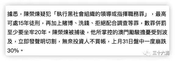 湾湾媒体最新报道,陈荣炼可能会获刑场达20年。 他本身可能涉及犯“执行黑社会组织的领导或指挥职务罪”,这个罪行最高可能会被判15年;加上非法经营网络赌博、还有洗黑钱以及前期拒绝配合警方检查等等,这个时间可能会加长。 林林总总算下来,他可能会被判20年,或者更久。 |
