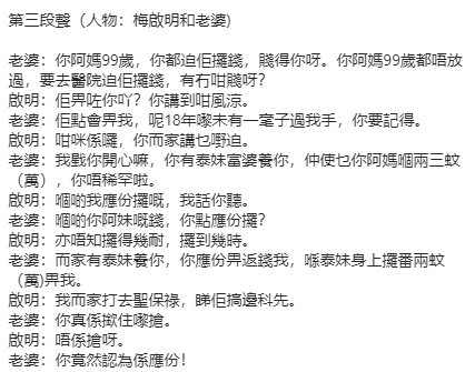 第二段录音是梅启明夫妇对话,妻子指责梅启明出轨泰国女友,提出离婚带儿子回马来西亚,还说因为梅启明酗酒,儿子险些被巴士撞到,儿子回港后闷闷不乐,已经不想再见到他,梅启明不仅没有给妻儿生活费,还反手拿走妻子的5000块及儿子1000块零用钱去养小三。 梅启明不以为然,称会向梅妈要生活费,指责妻子趁他没拿到钱就踩他。 |
