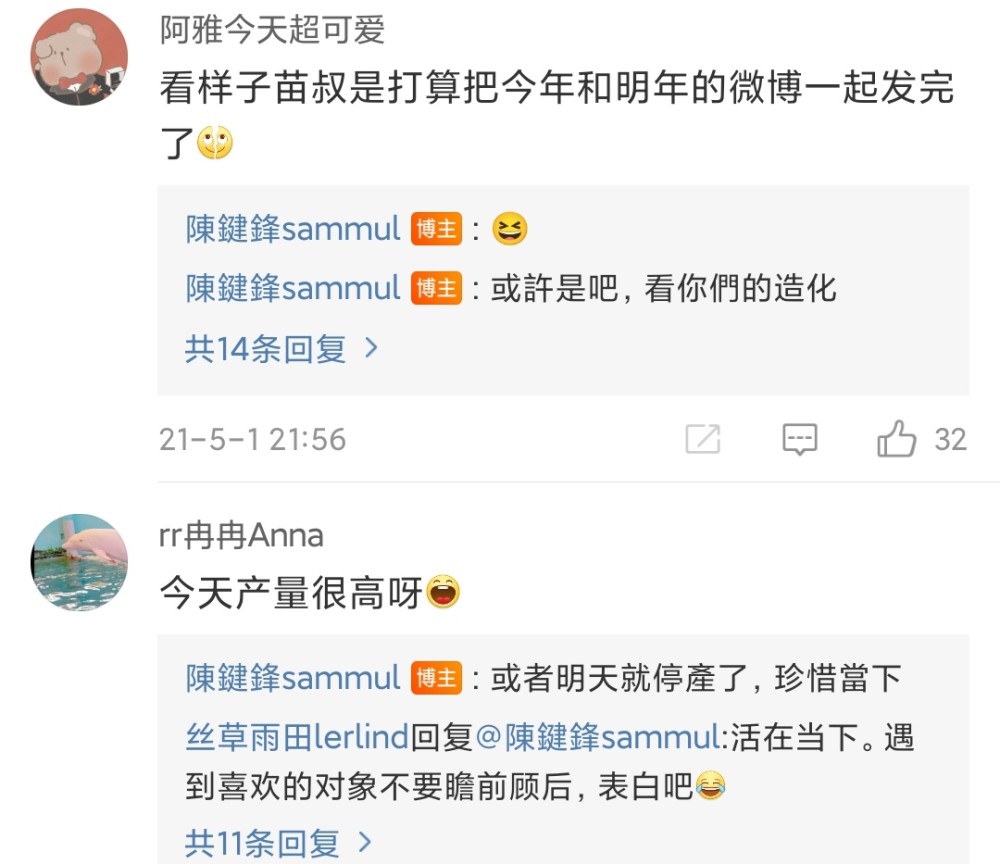 陈键锋在微博的互动停留在2021年5月1日,那天他为《封神榜:决战万仙阵》进行宣传,一连发了5条微博,与粉丝互动十分热络。另外,他在回复某个粉丝大赞当日更新频率高时就预告称:“或者明天就停产了。” |