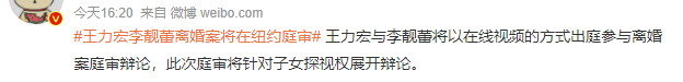 据媒体报道,王力宏与李靓蕾离婚案将于3月4日在纽约开庭,双方将以在线视频的方式出庭进行辩论,此次庭审主要是针对子女探视权展开。 |