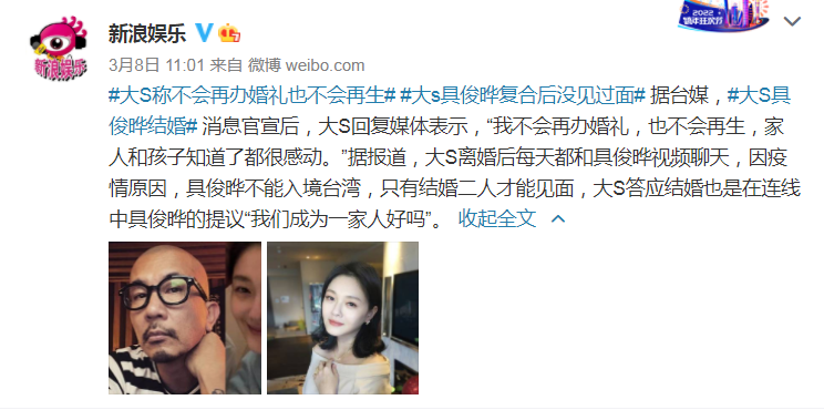 而且最神奇的是,这俩人甚至都还没见到面,只是视频聊了几次天,就把事定了,这回甚至是登记完才告诉家人(韩国那边说是可以线上完成登记,大S本人过不去也不影响办手续 |