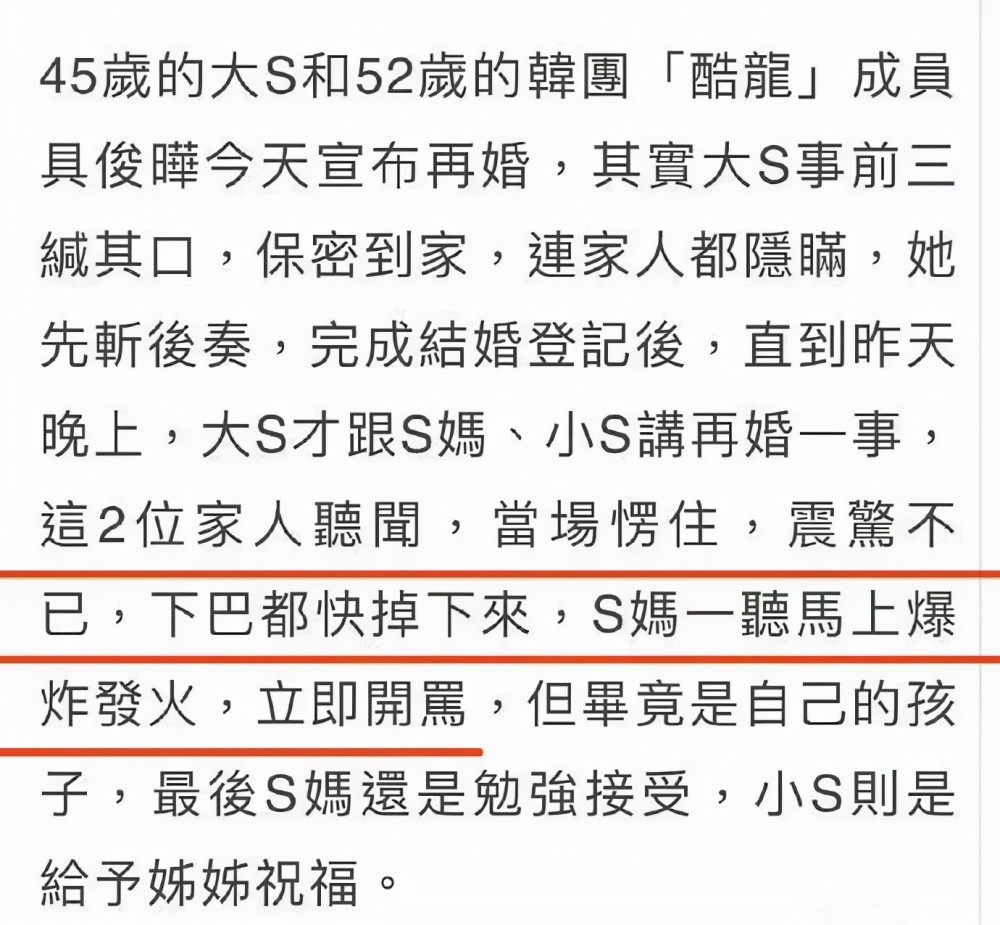 早在大S再婚的消息出来时,媒体就第一时间采访了徐妈妈,她说自己也是前一天晚上才知道女儿再婚的事情,听到消息后当场愣住,随即开骂,徐妈妈更是大喊“女儿不尊重我”。 |
