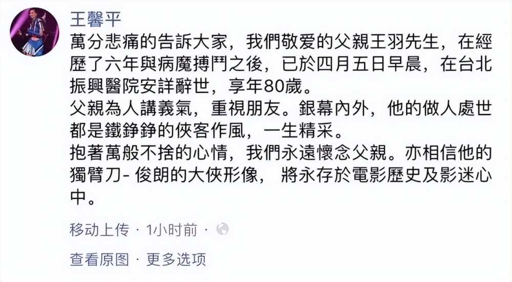 清明节当天,娱乐圈传来了一个噩耗,80岁的功夫巨星王羽去世。大女儿王馨平公布了父亲去世的消息,“我们敬爱的父亲王羽先生,在经历了6年与病魔搏斗之后,已于4月5日早晨,在台北振兴医院安详辞世,享年80岁。” |