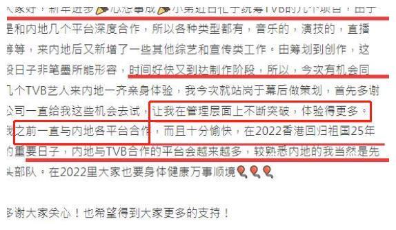 除了官方回应,王祖蓝本人也发表声明,表示正忙于TVB的几个项目,因为和内地深度合作,所以才会派他去进行策划,声明也表示出了对公司给予这次机会的感谢,除此之外,还展示出了希望内地与TVB多多合作的心愿。 |
