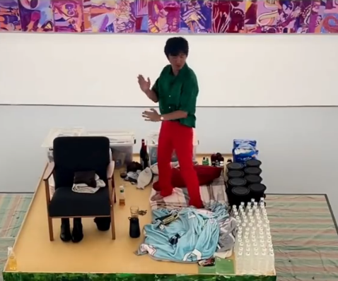 4月24日中午,刺猬乐队吉他手兼主唱子健前去打卡却发现门口贴了公告:为了配合防疫防控,庞宽的行为艺术展暂停对外开放,直播继续。 |
