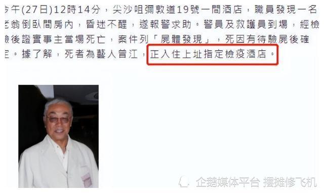 据了解这次入驻酒店是因为曾江25日刚从新加坡返回香港,26日时曾江的女儿还去探望,并未发现异常情况,但等到27日酒店工作人员上门,敲门无人应答后,打开房间发现曾江卧倒在房间里,等到警方到来后是确定了曾江死亡的讯息。 |