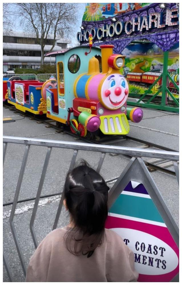 另外一天她又带着女儿去游乐场玩耍,这次她也是晒出女儿的背影,女儿看着这卡通版的火车也是看得很入迷,相信也是很想玩。 |