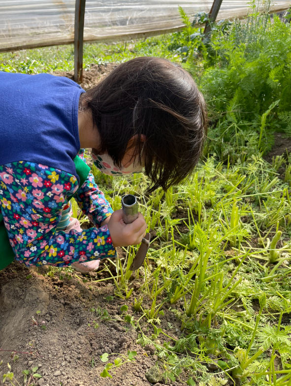 小饭兜还和爸爸一起去地里摘菜,体验收获的快乐。拿着小铲子给蔬菜除草,松土,体验农民伯伯的辛苦,虽然抓握的姿势并不是很标准,但能够有所劳动也算不虚此行。 |