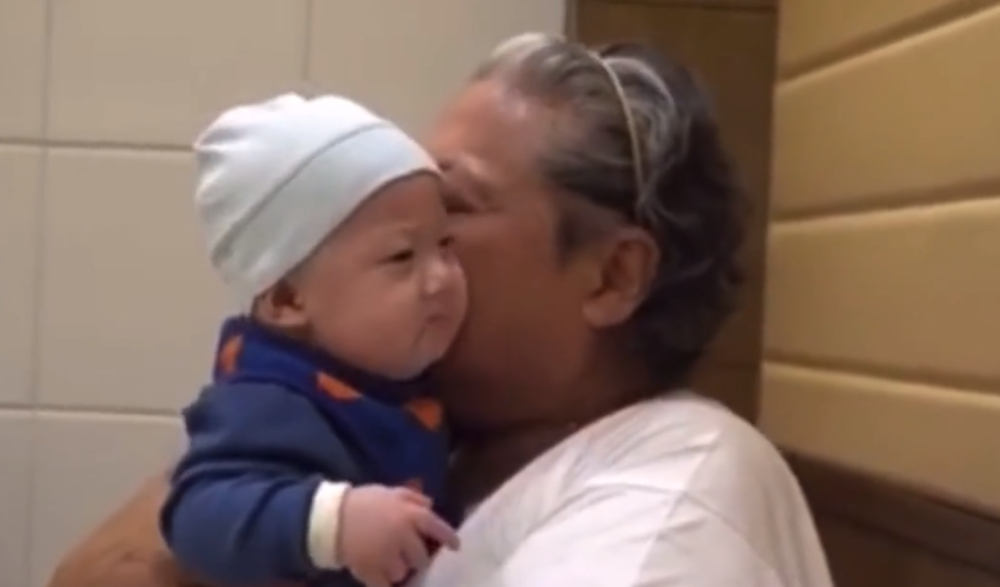 看到如此可爱的孙子,洪金宝再次忍不住凑上前去,希望可以好好和孙子亲昵一番。但洪金宝的胡子过于扎人,一直怼在孙子脸上,让他十分难受,从最开始的一脸笑意到后面开始撇着嘴。还无法讲话的孙子,最后只能用哇哇大哭来表达自己的不满。 |