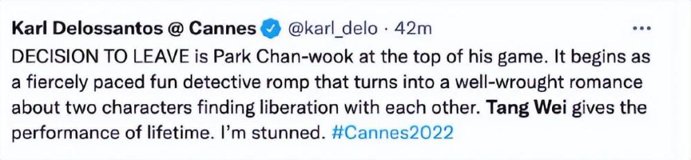 有人评价整个电影堪比《花样年华》,汤唯可以开始“公关”奥斯卡影后了;有人说《分手的决心》不一定是金棕榈,但汤唯会是戛纳影后;有人说汤唯奉献了她人生中最好的演技;有人直接就说:“汤唯的影后要来了”。 |