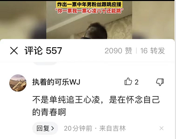 最有意思的是她炸出一大批中年男粉,很多网友晒自己80后90后老公们、兄弟们看王心凌初舞台的反应,他们有的跟着一起笨拙的唱跳、有的一脸痴汉脸盯着看、有的甚至偷偷抹眼泪。 |