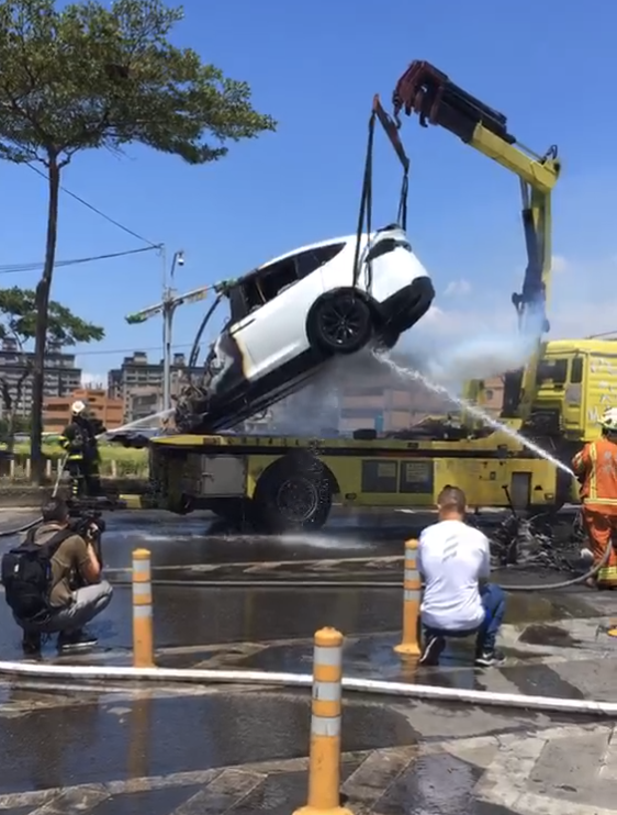 疑因电池起火难灭,到了下午两点,车辆仍然冒烟燃烧,救援人员不得不一直喷水降温,并持续呼叫救援。拖上拖车之后,车辆仍然在断断续续地燃烧。 |