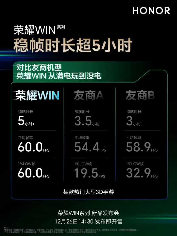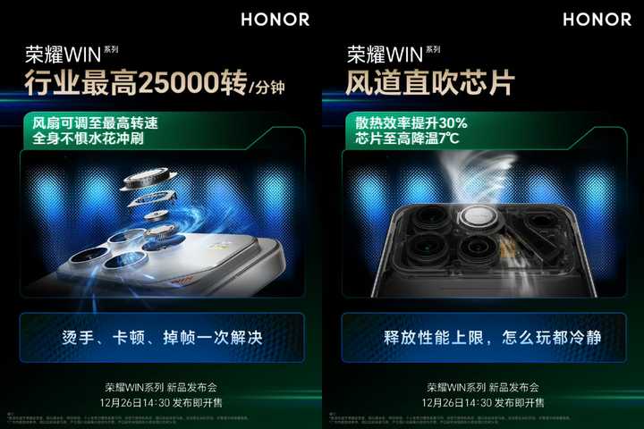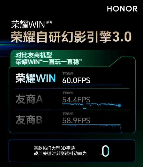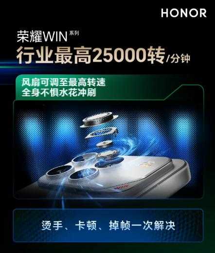 所以,荣耀WIN系列这种“摆脱原有赛道与竞品缠斗,引入更高维度的配置组合”的产品定义,显然对同价位的性能旗舰实现了“降维打击”! 而且“降维打击”的难道仅仅是性能旗舰竞品吗?其实反过来想想看,原本有不少用户为追求极致电竞体验选择专业游戏手机,却不得不妥协于其在影像、通信、AI等日常基础体验上的短板。 而荣耀WIN系列不仅兼顾了专业游戏手机的极致性能表现,还延续了主流品牌出色的日常使用体验——将绿洲护眼屏、青海湖电池、荣耀AI、荣耀通信等优势特色融入电竞游戏场景。这种“全场景体验无短板”的产品形态,对于专业游戏手机赛道而言,未尝不是另一种维度的“降维打击”。 Q2:荣耀WIN系列在同价位带来了怎样的优势体验? 荣耀WIN系列要说在同价位的产品优势,其实主要有三点:主动散热风扇带来的超强性能释放、10000mAh巨无霸电池带来超长续航、以及荣耀标志性的护眼、AI、通信等出色基础体验,尤其是前两者带来的全新体验让人印象深刻,也是下面要重点聊聊之处。 1、旗舰性能铁三角+主动散热风扇,满帧稳定输出 |