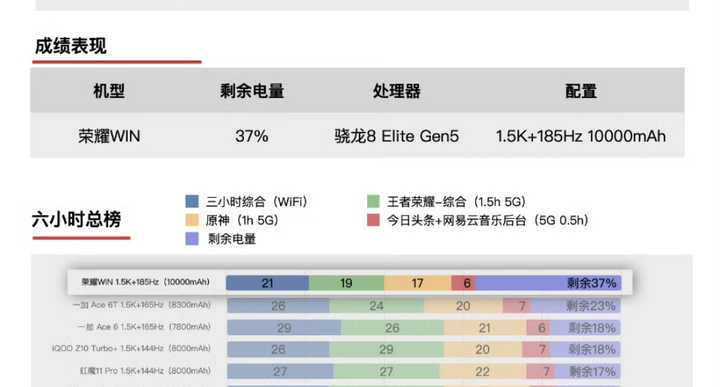 作为吃鸡玩家,我惊喜地发现荣耀WIN已经适配了165帧《和平精英》,一局下来平均帧率为164.3帧,几乎笔直的帧率曲线以及1.8的稳帧指数,表明荣耀WIN又是几乎满帧流畅运行,实际在游戏过程中,无论是大规模激烈枪战,还是飞速开车场景都感觉很丝滑。 两款热门游戏实测下来基本可以判定,荣耀WIN毫无疑问应该是市面上性能释放最强悍的机型,可能没有之一。强烈建议性能党、游戏党入手! 2、行业首个万级大电池,重新定义超长续航 这几年长续航一直是荣耀手机的一大标签,我们去查看各大手机续航榜单总能发现荣耀机型排名靠前。比如在小白数据库6小时重度续航实测中,配备7200mAh电池的荣耀Magic8 Pro续航实测稳居旗舰机型第一。 所以当搭载10000mAh青海湖电池的荣耀WIN发布后,毫无疑问就直接霸榜了所有手机续航榜单,在小白数据库中,无论是3小时综合续航测试,还是6小时重度续航测试,或者是极限续航测试到关机,荣耀WIN续航表现都是断档级第一。 比如在极限续航测试到关机的测试中,荣耀WIN撑到了10.03小时,而排名第二的机型仅有7.98小时,荣耀WIN与之相比足足多了2.05小时,优势非常惊人。 |
