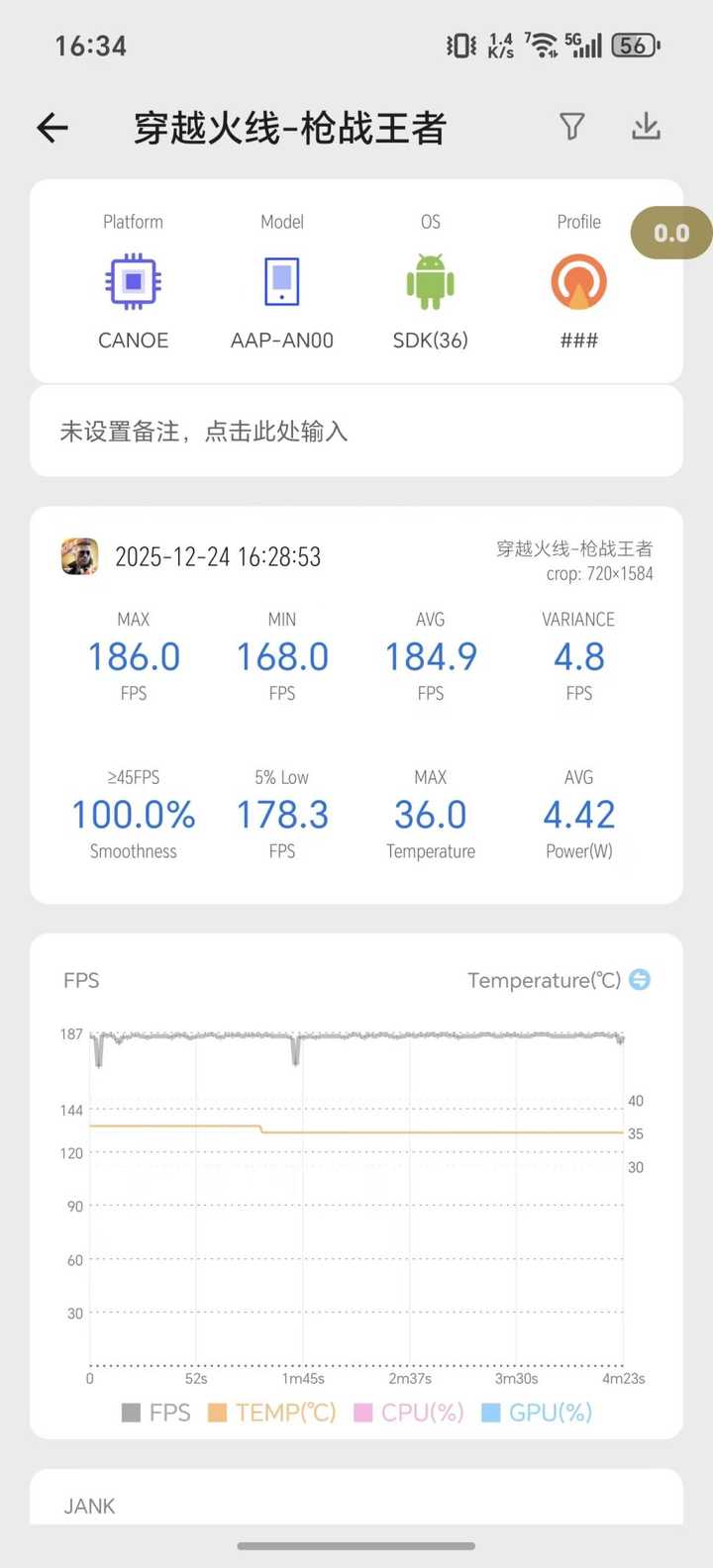 穿越火线的游戏画面设置全部为最高,开启185帧,我排位赛玩了几局,平均帧率184.9帧,方差4.8,5%LOW帧高达178.3,平均功耗4.42w。得益于高触控采样率,触控响应快,击杀总是快人一步,我这样一个手残党单局竟然完成22杀。 |