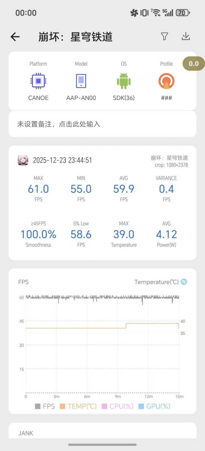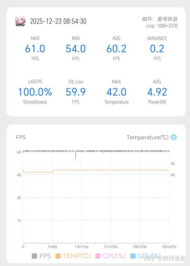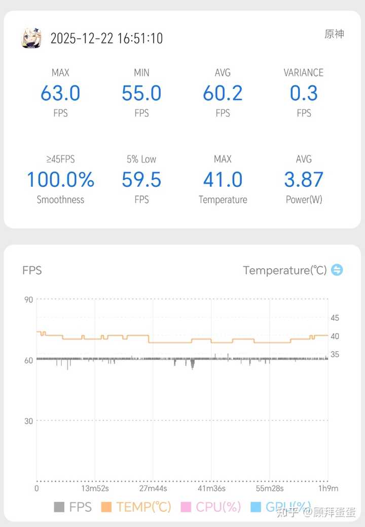 接着看《崩坏:星穹铁道》的表现,平均帧率59.9帧,5%LOW帧58.6,方差0.4,平均功耗4.12w,而且,在整个跑图过程中,手机给人的信心很足,就是跑多长时间都不会掉帧,实话说,荣耀WIN的这个表现实在是牛。 |