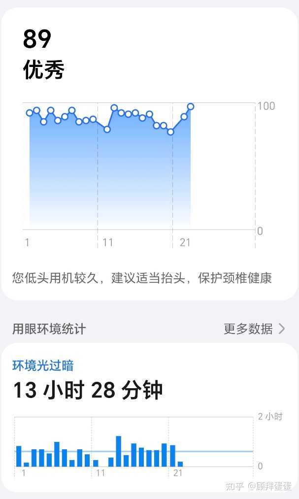 AI护眼部分,它并不是简单的根据环境调节色温亮度等,它会实打实的根据你的实际环境给予你建议,比如说低头玩手机时间久了它就会进行提醒,还包括一直在昏暗环境下使用手机它也会提醒,还有干眼友好等等,这些提醒都会以日、周、月度进行记录,当你看到数据之后,你会非常后怕,用眼坏习惯咋这么多。 |