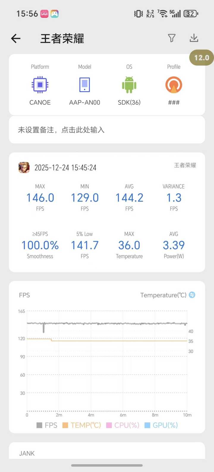 荣耀WIN的厚度8.3mm,重量为229g,这是在搭载10000mAh电池的情况下还能跟主流手机重量相当,很厉害。 二,性能超强,是电竞手机的天花板 荣耀WIN搭载第五代骁龙8至尊旗舰芯片(即骁龙8 Elite Gen 5),这是目前安卓阵营最高端的芯片,同时搭载LPDDR5X至尊版和UFS4.1的存储,最强性能实至名归,顶级的硬件自然会有顶级的性能表现。 荣耀WIN的屏幕是185Hz超高刷电竞屏,它原生支持部分185Hz游戏,还支持部分游戏通过GPU插帧的方式实现185Hz帧率,支持185Hz超高刷的游戏目前已经超过20款,类型包括FPS、音游、跑酷和MOBA等类型,另外值得一提的是,部分原生支持165Hz游戏(通过AI插帧也能实现185Hz)。荣耀WIN支持帧率增强和画质增强,可以将游戏的帧率提升,获得更好的游戏体验。 首先是《王者荣耀》,之所以给大家测试《王者荣耀》的实际游戏表现就是因为这是一款国民级游戏,玩家太多了,喜欢玩《王者荣耀》的小伙伴可以看一下测试结果,然后跟你现在在用的手机对比一下,看看两部手机玩游戏到底有什么区别。 《王者荣耀》支持144帧,从实测结果来看,平均帧率144.2帧,5%Low帧为141.7,平均功耗3.39w,这种功耗水平对荣耀WIN来说就真的是“从从容容、游刃有余”,简直优秀的不像话。 |