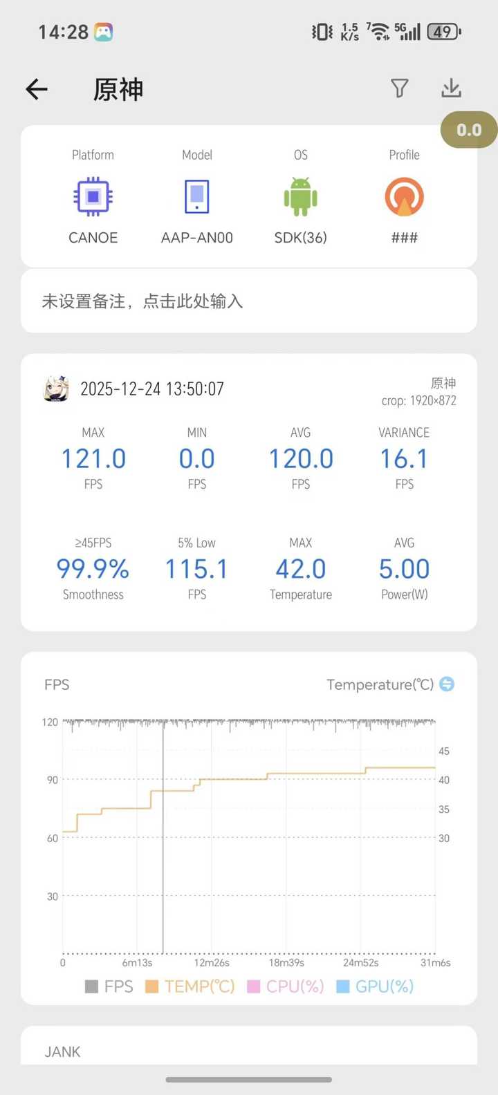 《王者荣耀》对荣耀WIN来说算是小意思了,我们直接上强度再看看另外一个3D手游大作《原神》的表现,《原神》这款游戏对于CPU和GPU的要求非常高,常被用来测试手机的游戏性能。 我测试用的是须弥城跑图,跑了30分钟,平均帧率120帧,5%LOW帧高达115.1,最高功耗8.86w,最低功耗4.28w,帧率方差16.1,平均功耗只有5w,在《原神》这样一款高负载游戏中能有这样的表现实在是有点逆天了。 |