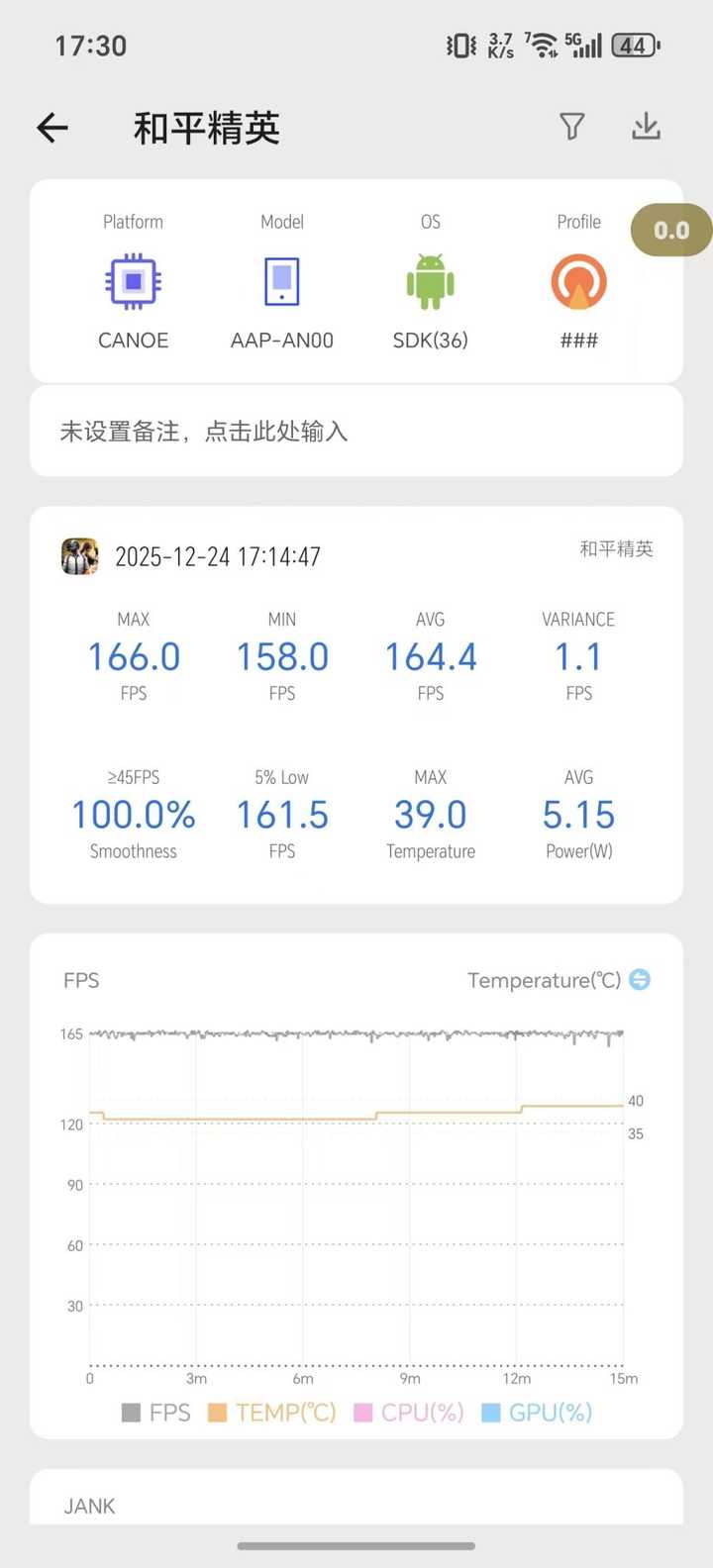 荣耀WIN支持移动端DLSS技术,通过AI超帧+AI超分技术可以将《和平精英》的游戏帧率提升至185帧,将720p分辨率画面提升至1080p。 玩了一局和平精英,平均帧率164.4帧,方差1.1,5%LOW帧161.5,平均功耗5.15w,非常优秀。软件显示的是165帧,是因为插帧无法被记录到。 |