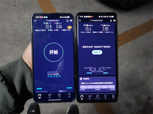 整体体验下来,感觉荣耀WIN的拍照确实不错,,对于一款电竞手机来说,实属难得。 七,通信 荣耀自研射频增强芯片C1+,已经在多款荣耀手机上搭载了,在地库、电梯等弱信号场景下,荣耀手机的信号明显会更好,下面是两部手机在同一个位置、同时用中国移动SIM卡做的网速测试,左侧的荣耀WIN网速明显更快。 |