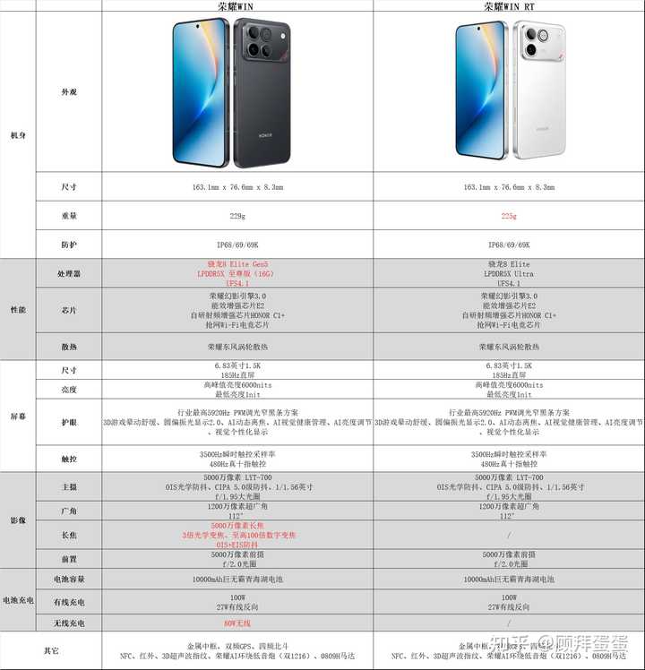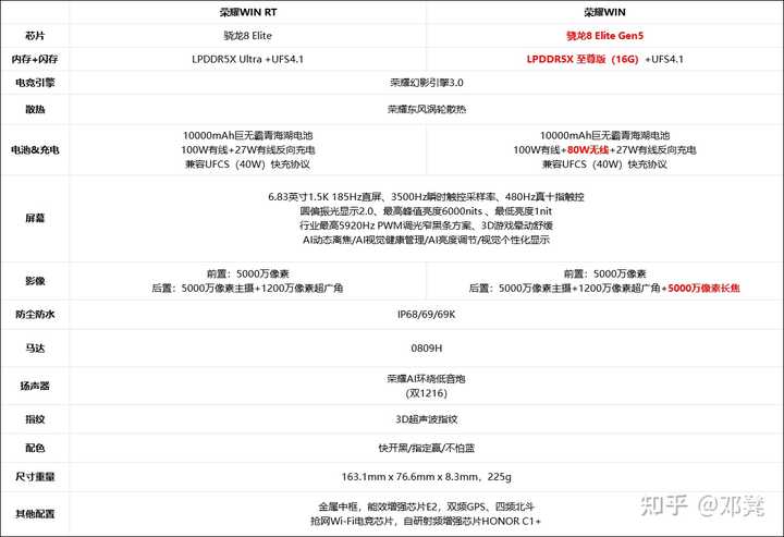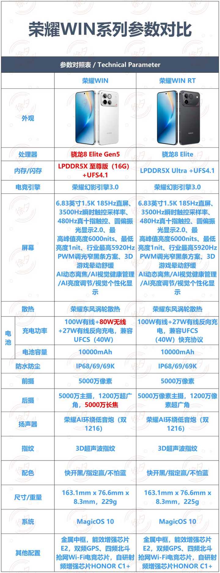 怎么理解呢?如果你喜欢轻薄、偏爱摄影,荣耀WIN 8.3mm+215/229g算不得太板砖、只是一个Pro旗舰的水平,基础版不错的主摄、RT版全焦段影像也能满足日常生活,但它也没有任何的吸引力,风扇的存在还十分多余;如果你需要长续航、就爱玩点游戏,荣耀WIN 10000mAh电池+内置风扇直吹SoC散热+185Hz电竞绿洲护眼屏,那简直是真神降临、强的可怕、“耀耀领先”。说到底,这是一个有着鲜明特色、面向特定人群、体现了不错技术实力的“年度长续航电竞夯机”。 产品配置简单总结如下:芯片:标准版(荣耀WIN RT)骁龙8 Elite(LPDDR5X+UFS 4.1) / Pro版(荣耀WIN)骁龙8 Elite Gen 5(LPDDR5X Ultra+UFS 4.1)电池:标准版10000mAh + 100W快充+旁路供电;Pro版10000mAh + 100W快充 + 80W无线快充+旁路供电屏幕:两款均为6.83英寸、1.5K京东方OLED直屏,支持185Hz LTPS、5920Hz PWM调光前置影像:标准版16MP(IMX480) / Pro版50MP(IMX816)后置影像:标准版50MP主摄(LYT700,1/1.56")+12MP超广角(IMX564,1/2.55");Pro版50MP主摄(LYT700,1/1.56")+50MP超广角(OV50M,1/2.88")+50MP直立长焦(IMX856,3x)机身尺寸:8.3mm,标准版215g、Pro版229g防护等级:均为IP68/69/69K 解锁方式:均为3D超声波指纹(支持湿手解锁)外围配置:全系0809X轴线性马达、AI按键、IP68/69/69K、内置风扇、NFC、红外、1216对称双扬、自研射频芯片C1+;Pro版E2能效增强芯片、USB3.2 Gen1 |