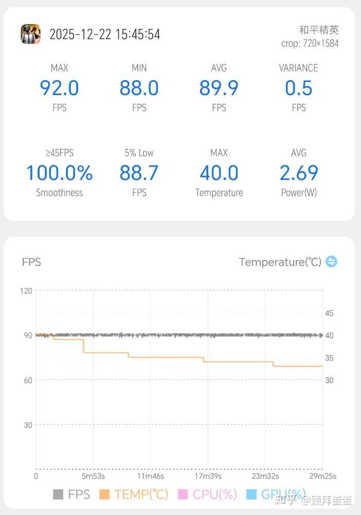 单一的游戏测试肯定没有说服力,特别是对于幻影引擎而言,所以又接连测试了几个日活比较高的游戏。 《和平精英》HDR高清+幻影稳帧 一整局的游戏30分钟,荣耀WIN平均帧率89.9帧,最低帧率88帧,最高帧率为92,帧率曲线依旧完全就是一条直线,很显然荣耀WIN对于这类国民手游来说没啥难度。 |