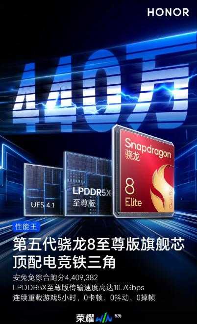 此次荣耀WIN系列采用当下最顶级的电竞配置,诠释了如何在该价位段性能“赢麻了”。性能铁三角方面,采用骁龙8 Elite Gen5+LPDDR5X至尊版+UFS4.1的组合,该配置为当前顶级硬件设备,安兔兔综合跑分高达44万分,传输速度高达10.7Gbps,确保手机能够有持续的性能释放与快速的游戏加载体验。 |