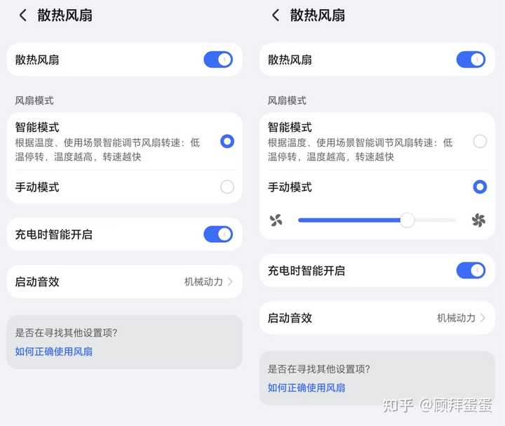 散热风扇可以选择智能模式或者手动模式,在智能模式下,系统自动调节风扇转速,温度低时关闭,温度高时开启。在手动模式下,可以手动调节风扇转速。另外,在炎热的夏季充电时,可以给手机散热,提高充电速度,而且,荣耀还贴心地设置了3种启动音效,结合动听的音效给人特别的仪式感,跟电竞手机特别搭。 |