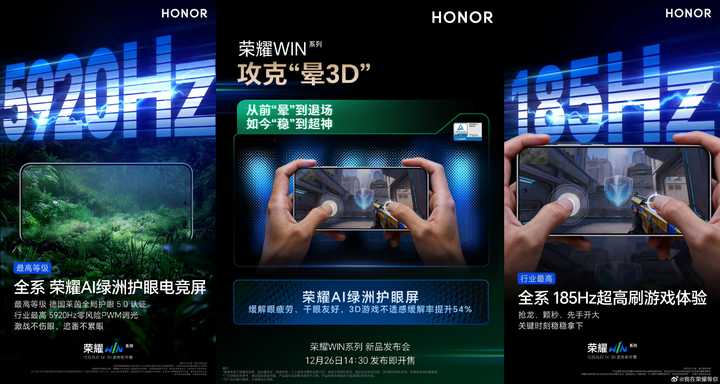 代价也是有的,官方宣称风扇噪音≤28dB(类比环境声)。但如果是比较安静的环境、重载场景下可能会产生可感知噪音(类似笔记本高负载状态)。 3. 185Hz高频直屏+AI幻影引擎:游戏体验的精准打磨 荣耀WIN采用6.83英寸LTPS OLED直屏,支持185Hz刷新率与5920Hz PWM调光,通过德国莱茵全局护眼5.0认证。对比同价位竞品,在触控响应(0.1秒超声波指纹)与护眼表现(降低76%眼疲劳)上形成明显优势。智能手机的本质是显示与交互。一块顶尖优秀的屏幕,让用户可以畅快游戏且无用眼压力。 |