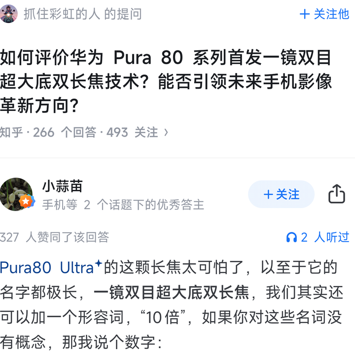 又到了小米出啥就是意义不大,没啥用的环节。 和苹果比确实是欺负苹果,毕竟苹果是原生100mm,75mm是纯靠主摄裁切。 但苹果100mm的1/2.55确定能反超1/1.4吗? 至于拿相机比的,只能说比器材永无止境。 而说什么和相机相比的,今年吊打微单的是哪两位来着? 还有拿p80u来对比的,别来招笑了好吧,p80两个焦段是3.7倍和4.7倍,那个9.4倍是因为在4.7倍的时候镜头不能完全覆盖像场裁切的。一大一小两个定焦和连续光变比?况且p80u的10倍摄像时还不能用,一个残废的定焦也能吹? 还是来看看当初一镜双目吹成什么忘了吧。 如何评价华为 Pura 80 系列首发一镜双目超大底双长焦技术?能否引领未来手机影像革新方向?494 关注 · 266 回答 问题 来,你们自己看看前排,当初吹成什么样了。 我就不说别人了,来看看敬爱的小蒜苗同志 |