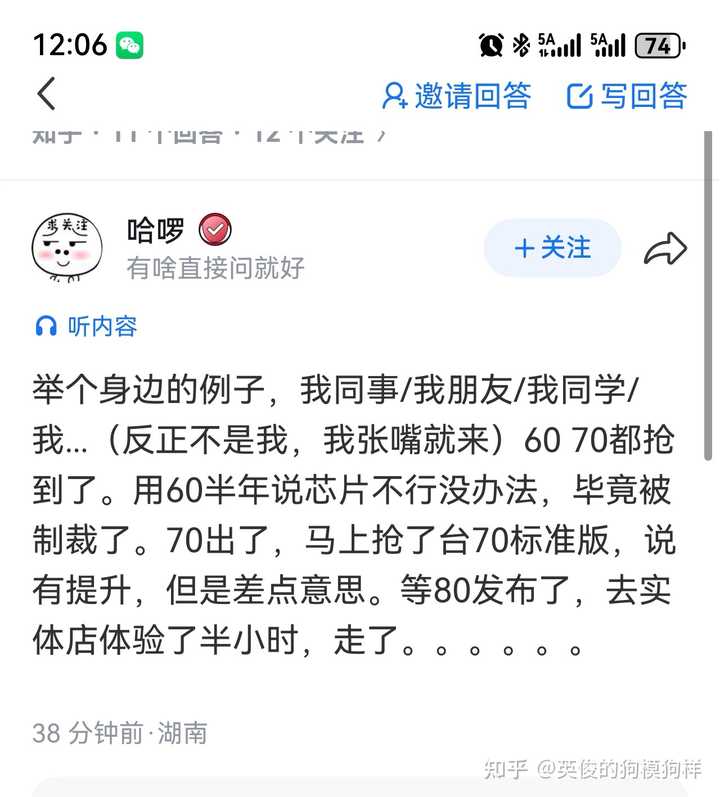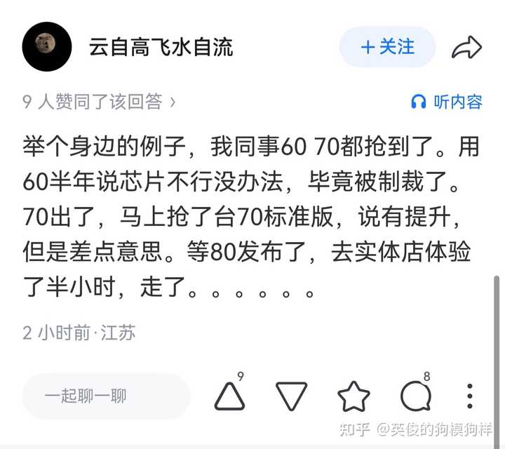 举个身边的例子,我同事/我朋友/我同学/我...(反正不是我,我张嘴就来)60 70都抢到了。用60半年说芯片不行没办法,毕竟被制裁了。70出了,马上抢了台70标准版,说有提升,但是差点意思。等80发布了,去实体店体验了半小时,走了。。。。。。 送礼物 还没有人送礼物,鼓励一下作者吧 |