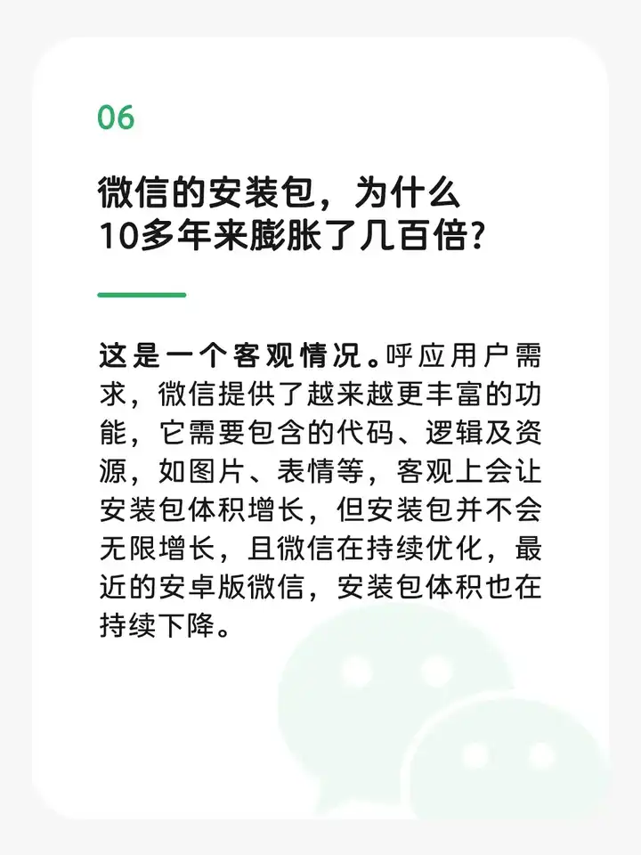 [数码]微信回应占储存空间8个争议点,承认安装包十多年膨胀了几百倍,这种膨胀有必要吗?用户到底需要什么功能? |