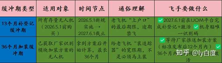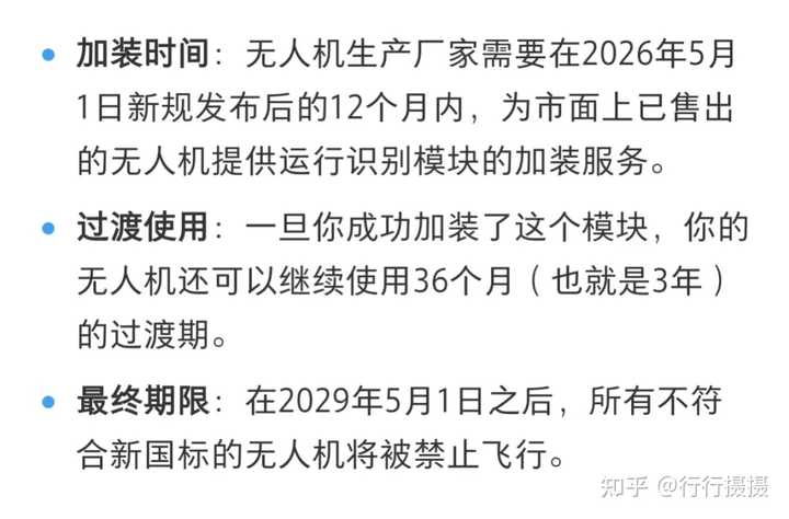 我自己有时候也会玩一玩,不过都是拍拍风景,人多的地方根本不敢去赌,每次在市区、景区看到地上人挤人,天上还悬着无人机就会很紧张,就怕突然控制不住,而且人群上空飞还很烦人。 新规出台,一方面会让个人航拍行为更加规范,另一方面,也会有很多人担心限制太多,不小心踩线。目前来看,影响比较大的是2026年相继生效的两项强制性国家标准和新修订的《民用航空法》。 两项强制性国家标准即: ①实名登记激活。完成登记激活前无法飞行。 ②搭载运行识别模块。飞行时需以秒级间隔报送身份、位置、速度等信息。 实名登记早就有了,至于运行识别模块,2026年5月1日后所有在售机型都必须满足,不然无法销售。对于存量旧机,需在规定时间内进行升级改造并补登记,否则将无法飞行。 已售出无人机改造期限为新规生效的12个月内,12个月内完成加装运行识别模块,使用年限可延长至2029年5月1日,之后无运行识别模块的无人机将全部禁飞,相当于强制报废。 |