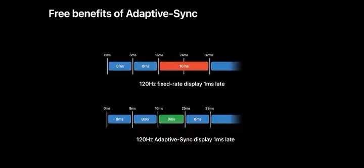 iPhone Pro支持如下刷新间隔: 120Hz (8ms)80Hz (12ms)60Hz (16ms)48Hz (20ms)40Hz (25ms)30Hz (33ms)24Hz (41ms)20Hz (50ms)16Hz (62ms)15Hz (66ms)12Hz (83ms)10Hz (100ms)1Hz (1000ms) 支持多档刷新率真的不叫事儿,毕竟基于特定内容,甚至压根儿就是基于特定app做的所谓自适应高刷新率调整,本质上就是提供了场景化的多档切换罢了! 苹果真正要做的,是基于实时内容变化调整刷新率的Adaptive-Sync呀! |