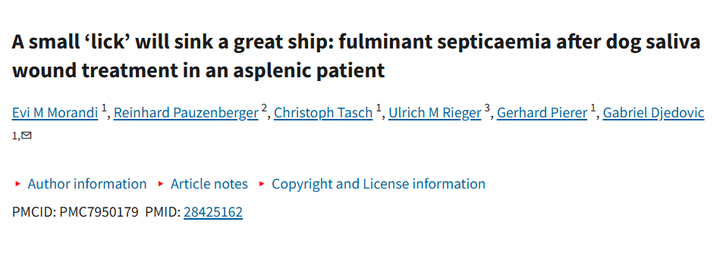 该图片有可能会引起不适 继续查看 这个病例的论文标题也很有意思:《A small 'lick' will sink a great ship》 为什么有人被狗舔一下就没事,有人就会这么严重? 免疫力 这个41岁的男人没有脾脏(可能之前因为某种原因切除了)。 脾脏是免疫器官 |
