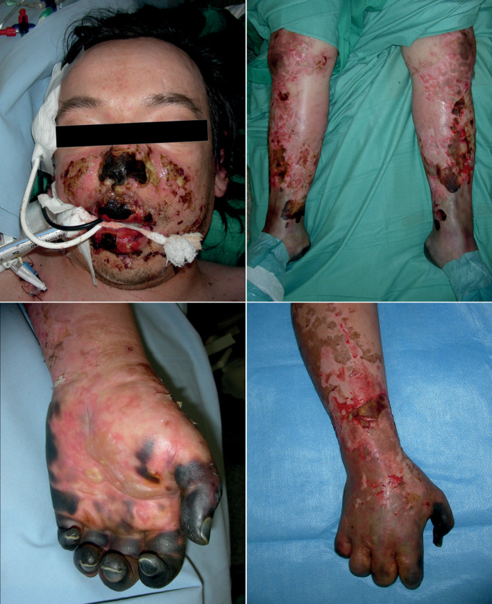 该图片有可能会引起不适 继续查看 很明显,被感染了。 而且,他已经进入了败血性休克,多器官开始衰竭:肾衰竭、肝衰竭、凝血功能障碍。 医生立即给他上了强效抗生素,同时做细菌培养,想找出是什么菌。 但这种细菌很难培养。 几天后,PCR检测结果出来了:犬咬二氧化碳嗜纤维菌(Capnocytophaga canimorsus)。 这种细菌在狗的唾液里很常见。 它有一种特殊的能力:骗过人类的免疫系统。(抵抗人类的补体系统和中性粒细胞的杀伤)[4] 简单说就是:你的免疫系统看不见它,或者看见了也打不中它。 这个男人算幸运的。因为及时用了抗生素,但他在ICU住了很久。 另一个41岁的男人就没那么幸运了[5] 也是狗舔了他的伤口。感染了同样的细菌:犬咬二氧化碳嗜纤维菌 他很快陷入败血性休克,出现了弥散性血管内凝血——简单说就是全身的凝血系统紊乱,到处都在形成血栓,同时又到处都在出血。 四肢末端因为血栓导致缺血坏死,变成了黑色。 (图片谨慎查看) |