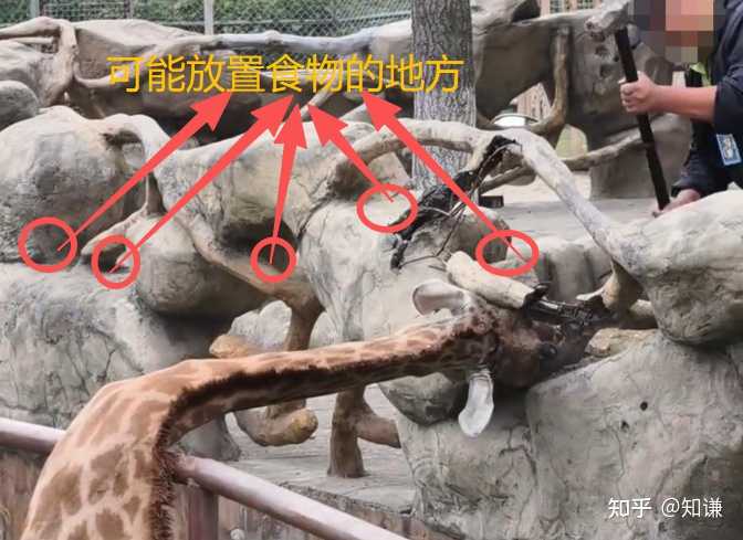 可见,要是它们颈部不耐弯折,早就折在那儿了。 因此,对于长颈鹿而言,放低身姿,把颈部弯曲成将近 90°,将头伸向栏杆,也是有可能的。 这倒不是因为它们调皮,更不是玩儿嗨了,而是: 栏杆处有东西吸引了它。 啥玩意吸引了它? 对长颈鹿而言,能让它主动把颈弯着、把头偏着,然后伸向栏杆的, 就只有食物了。 但是,这食物并不是被人简单放置于下图标示的栏杆空隙处的。 |