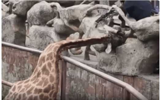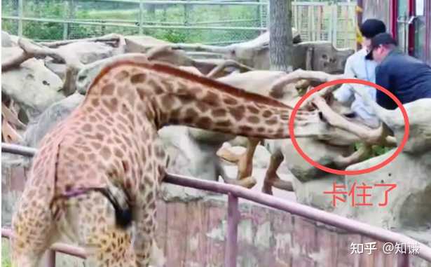 长颈鹿轻松用舌头取食简单放置食物示意图既然这样,到底是怎样的骚操作,才导致长颈鹿把头卡住的呢? 这个也很简单,就是有人在投喂长颈鹿时,发生了拉扯,让长颈鹿努力把头伸进栏杆缝隙处取食,不小心卡在了缝隙里,如下图↓。 |