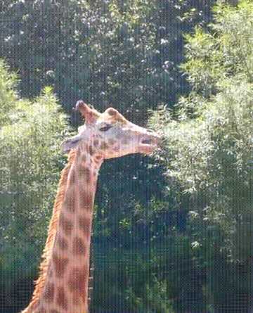 这一过程,长颈鹿肯定会很不好受。因为锤子在砸栏杆的同时,力量绝对会对长颈鹿的头部和颈部造成冲击。 关于这一点,我也不多说,大家看看下面的动图,就一目了然了↓。 注意看:长颈鹿的头颈在剧烈的冲击下,有明显的震颤。 |
