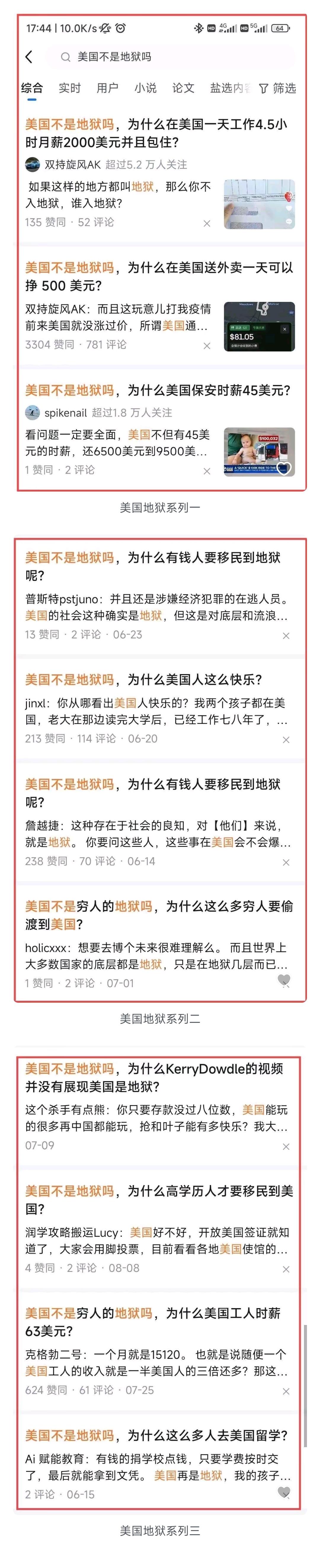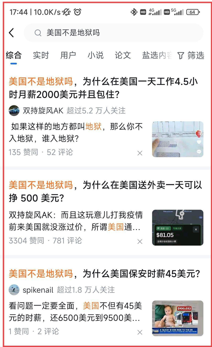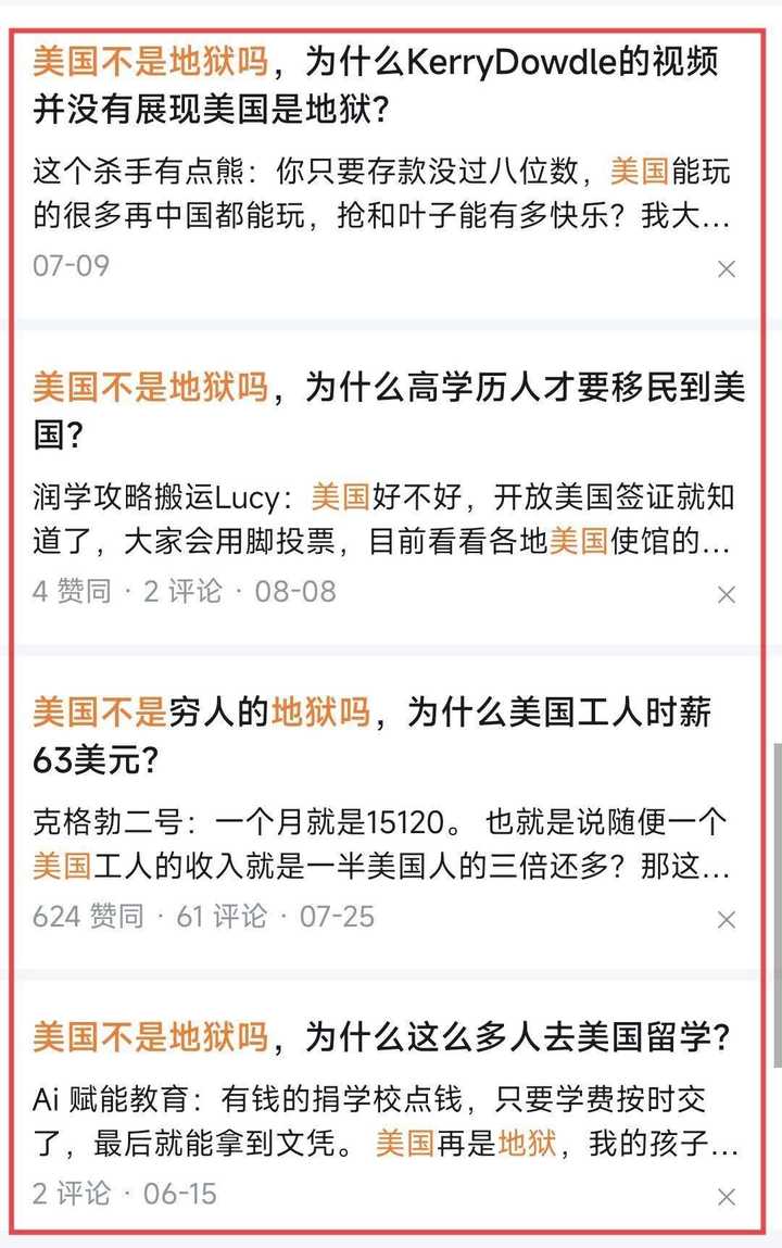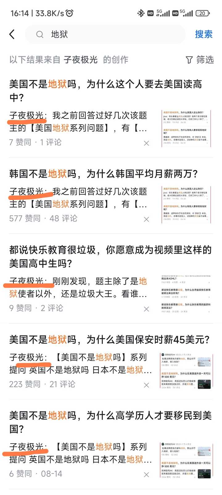 我给他起了个外号,叫“地狱使者”。我跟他缠斗了快一年多了。 他是著名的【某某不是地狱吗?】专题主。 他的大多数问题都是以“美国不是地狱吗”起手。你在他个人空间里面搜索,以【美国不是地狱吗】为关键词,你可以看到他提出过如下问题 美国不是地狱吗,为什么美国保安时薪45美元? 美国不是地狱吗,为什么美国最低时薪十多美元? 美国不是地狱吗,为什么高学历人才要移民到美国 为什么有钱人要移民到地狱呢? ......................等等 以上这些【美国地狱】系列勉强还算正常,但是接下来就越发离谱了。甚至让我怀疑我是不是进了某个异次元时空。 美国不是地狱吗,为什么在美国一天工作4.5小时月薪2000美元并且包住? 美国不是地狱吗,为什么在美国送外卖一天可以挣500美元?【那一年就是18万美元,行吧】 美国不是地狱吗,为什么在美国修空调能年入百万? 【这条是最让我绷不住的,美国修空调一年收入百万?你要不要看看你自己在讲什么。那上面送外卖的那位为什么不去修空调?年收入一下翻了6倍呢!】 美国不是穷人的地狱吗?为什么美国工人时薪63美元?【所以这位工人为什么不去修空调或者送外卖】 美国不是地狱吗,为什么美国免费医疗不花钱? 美国不是地狱吗,为什么美国免费给流浪汉食物吃吃喝喝,流浪汉个个喜笑颜开? ................ 其中不乏几千人回答的热门话题。几千个回答啊。大场面了属于是。 以下的知乎热门问题,均是该题主提出的。 |