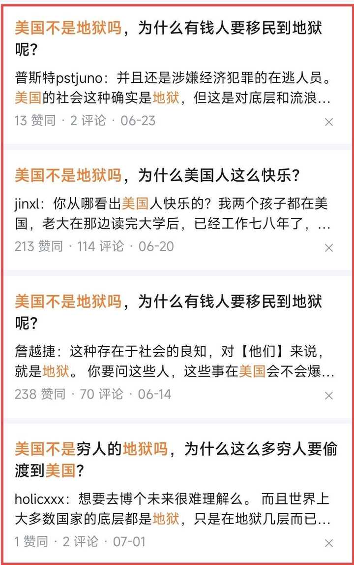 该题主有整整126个问题,大多数均以“美国不是地狱吗,为什么.......”作为起手式。其中不乏热门问题。当然,美国这个地狱研究的太过透彻,偶尔也会厌烦,于是题主会改改口味,如下所示。 |
